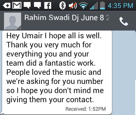 Dear Umair, Just wanted to drop you a note to say *Thank You*! for all your efforts to make out wedding reception so perfect! Everyone, young and old, couldn't say enough about you! You were able to satisfy everyone's musical tastes by mixing songs that please everybody. (I loved the coke studio songs and strings you threw in!! :) Everyone I spoke with told me they had a wonderful time and the music was perfect! Music is the most important part of a wedding and you filled the role perfectly! We appreciate all your hard work and thanks again for making our wedding so special! We will definately continue recommending you to everyone we know! Warmest Wishes! Mariam and Atif |